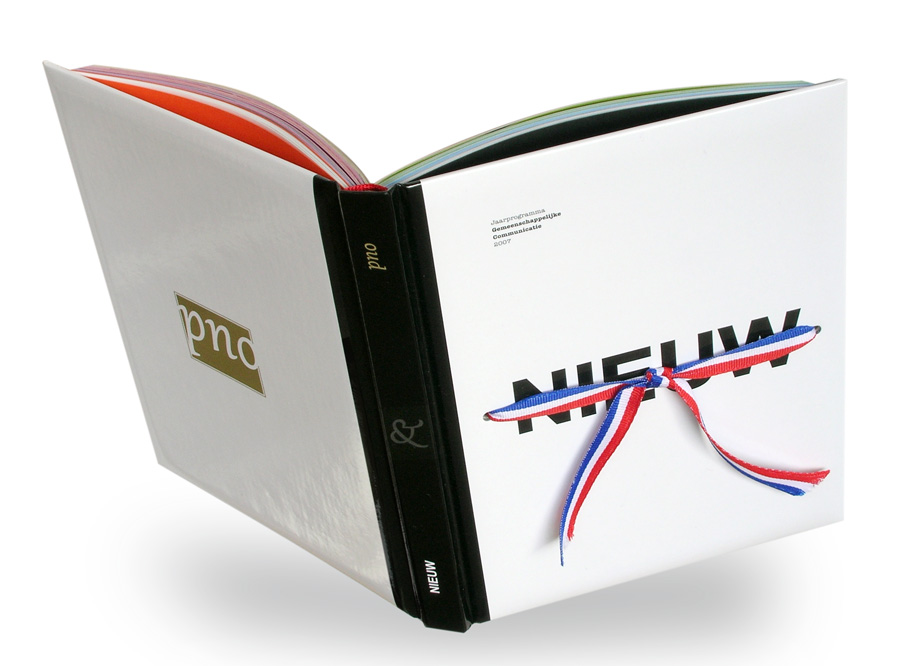 De twee zijden hebben een sterk contrasterende vorm. Er werd gewerkt met diverse papiersoorten, een opgedikt omslag met strik (handwerk).